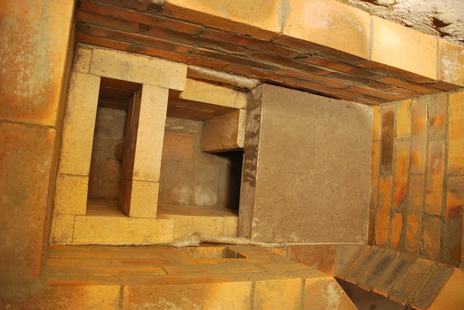 The sharp corners have been left on the inner edges of the smoke path, i.e. The left side wall of the fire box and the left edge of the slab, as turbulence at these points would help throw flame up onto the plates.