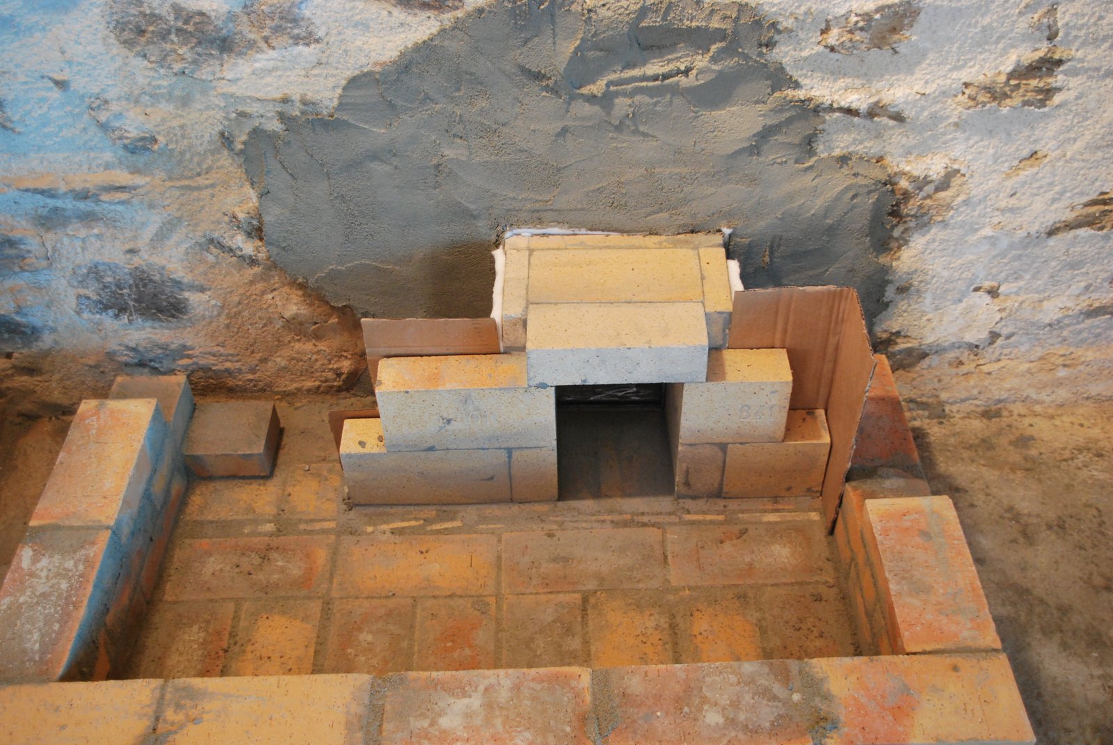 The last course of the fire box walls is layed dry. This gives the advantage that it can easily be adjusted or moved once the stove has been lit and the precise actual smoke path has been seen. If layed in mortar they would brake bond and become loose during the first few fires.