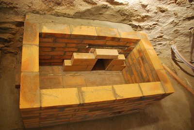 The first course of the fire box. The walls of the chamber and the down channel are gasketed with two sheets of glass fiber mat.