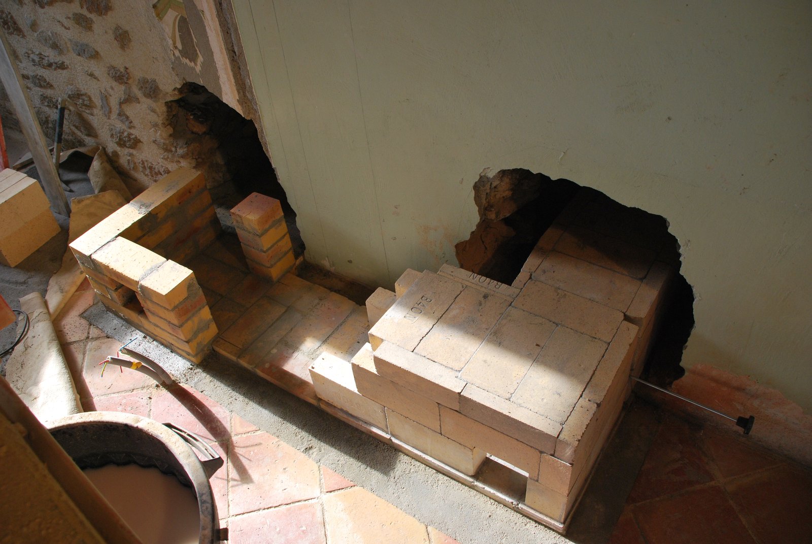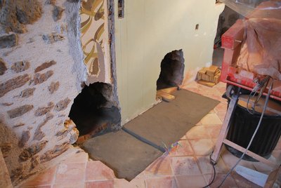 The far side of the wall. The chimney's location is in the for ground to the right of the cookstoves transmission tunnels opening in the wall, and the run of the heaters transmission tunnel behind it. Note a lime concrete skim slab was pored inadvertently on to a 3cm thick layer of cork insulation by the home owner. This slab was cut away and the cork removed.