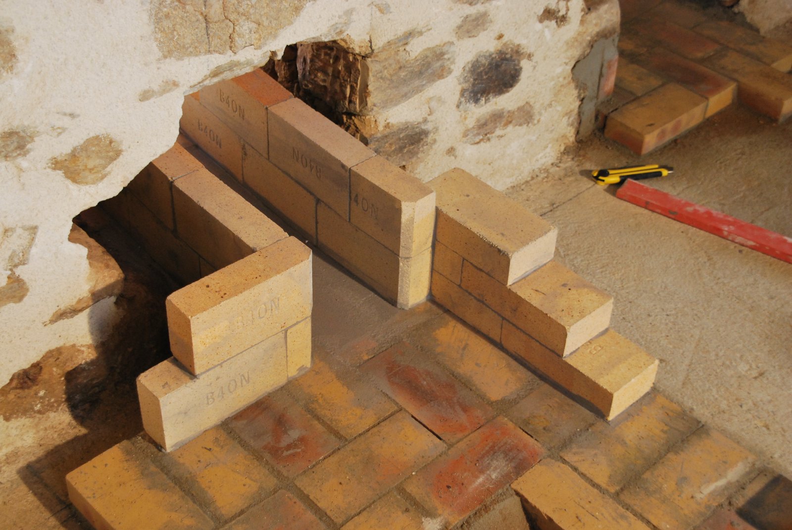 The heaters tunnel as it traverses the wall. It is at this point that the heaters damper will be installed. Note the wide groove cut into the base course to accept the bottom of the damper frame. The two thinner groves in the top and base of the tunnel are to accommodate the stabilization fins on the damper frame. These fins are intended to stop the frame sliding during operation of the damper. A semi circular groove is cut into the middle of the tunnels wall at right, (between the two courses that form the tunnels wall) to accommodate the bulge in the frame where the guillotine plate handle passes into the frame when the damper is in the closed position. (see next image)