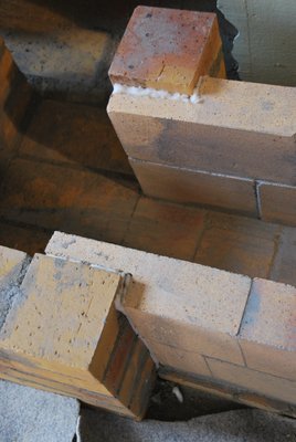 The column of half brick at the corner of the support pavilion, must be layed with care, and not dislodged during laying of the fire brick of the tunnels and the wool gasket between the two.