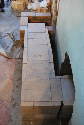 The slab for the tunnel is re-poured (after the cork has been removed) up to the hight of the finished tile floor in order to encase the electric cables that unavoidably run across the tunnel's footprint. The base course of the heaters tunnel will be layed in splits, seen at the right of the opening, to arrive at the same hight as the cookstoves tunnel, where both join the chimney.