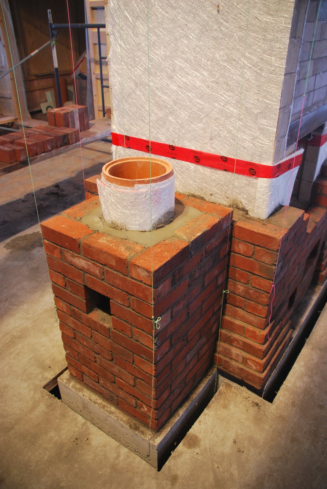 The first 4 courses of the core in clay brick layed in Type N and the rear manifold wall in medium duty refractory brick. The rear manifold wall supports the core and refractory brick are wider than the clay facing brick, so more stable when employed in this situation. The chase in the centre of the rear manifold wall allows primary air to pass between the core and facing. The square opening is an access opening to the left side channel via the rear manifold.