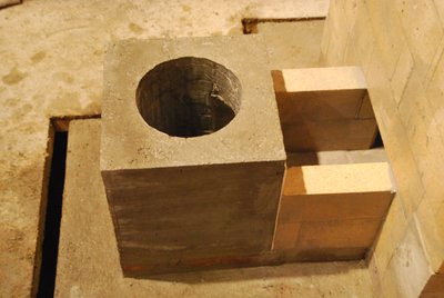 The elevated foundation. The opening in the centre is for the ash drop and the smaller opening behind it, an outside air intake. This smaller opening is positioned to be between the core and facing just below the air intake door in the facing. It leads to the void of a block on the last course below the slab. The stove will not use outside primary air. This set up though allows outside air to be linked up in the future, should it be desired, by opening the block on the last course of the foundation in the basement.