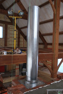 8 inch ID stainless steel flue will be used after 8 feet, in order to avoid using clay liner tiles which can deteriorate on the upper portion of the chimney. The clay flue tiles used in the lower 8 feet are gasketed and backfilled against the brick, making it unlikely that they should move or leak if becoming fissured. As the tiles below the damper remain relatively warm, they are less susceptible to thermal shock. It could also be argued that the first 8 feet of masonry is part of the stove, being an updraft channel, and the chimney proper, starts after the anchor plate at 8 feet.