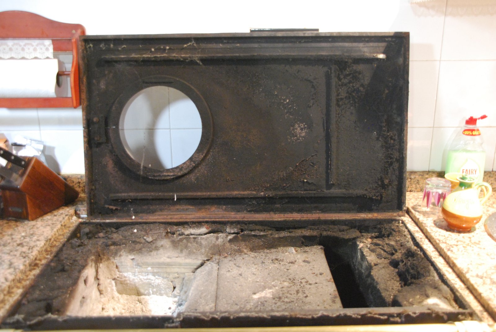The cast iron cook top can be raised to allow cleaning. The smoke path runs from the fire box at left, over the oven and down the right side of the oven , underneath the oven, and into the chimney.
