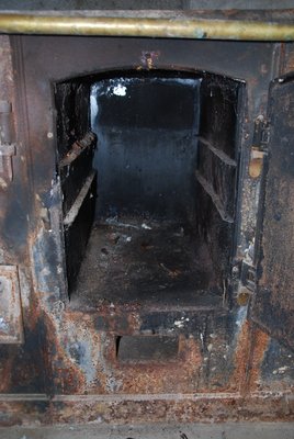 The oven, and under oven channel access opening. The interior of the oven is heavily coated with soot and creosote indicating that it had rusted through to the smoke path well before the stove was abandoned.