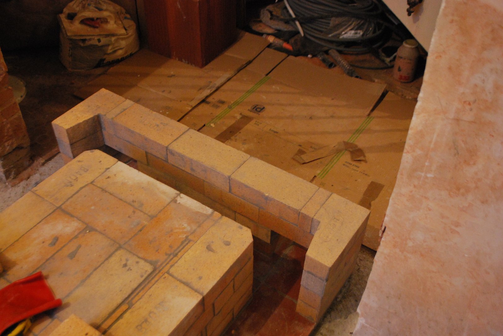 A course of clay tile have been layed to gain some height, (as opposed to a course of thicker clay brick) and because they were available. The tiles also form a clay base for the bottom of the smoke path in the manifolds.