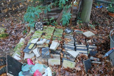 The original concrete floor tiles of the kitchen had been stacked in the garden.