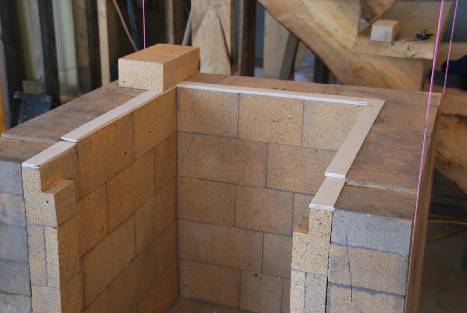 The whole fire box is lined with splits layed as shiners. Note that the liner has a one eight of an inch ceramic felt gasket behind the two back corners. The liner is cut one quarter inch below the level of the top of the last course of the firebox wall in order to accommodate a ceramic felt expansion gasket.