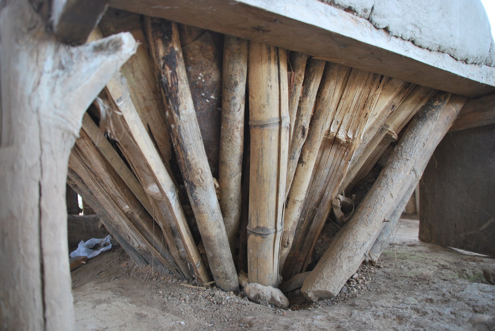Due to a scarcity of sawn wood the foundation is made of bamboo, arranged to form a funnel shaped frame that is filled with clay.