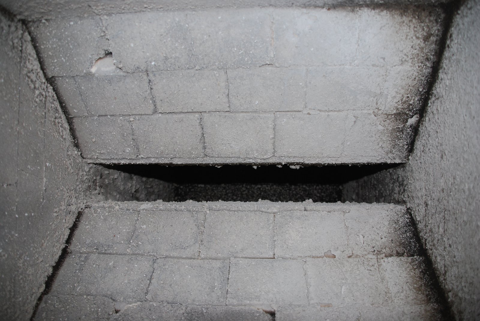 The fire box is built in traditional style its walls consisting of a single wythe of brick layed flat. Today most contra-flow fire boxes are built with walls consisting of 2 independent wythes of shiners. This offers a possibility of replacing the inner wythe should the surface of the brick ever become badly spalled.