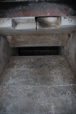 View up through the fire box. One full brick, layed lengthways across the lintel, has cracked down the middle along its length, and from side to side across the middle. Three quarters of the brick have fallen, or been pulled away, while one quarter has remained in position.