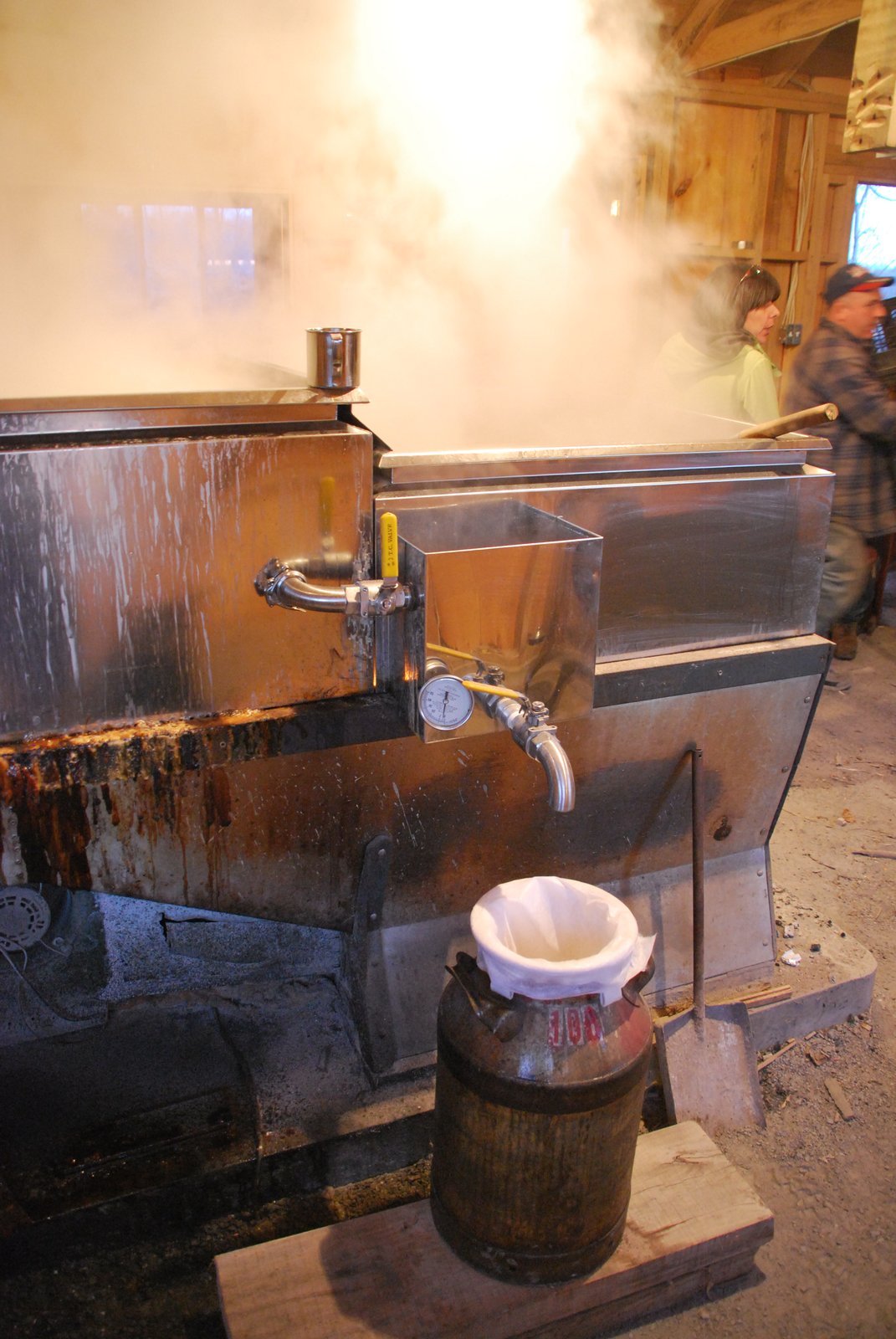Here the syrup is at the right consistency. A temperature gauge is also used to determine the time to draw off the syrup. The sap boils at 212 ºF gradually increasing in temperature as it thickens. The boiling temperature of the finished syrup is 219 ºF