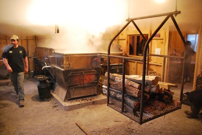 The large arch needs to be regularly fed with wood, the object being to fire it as hot as possible, for fast evaporation. With the two evaporators running in unison, the sap in the large evaporator is still relatively light and so there is little risk of burning.