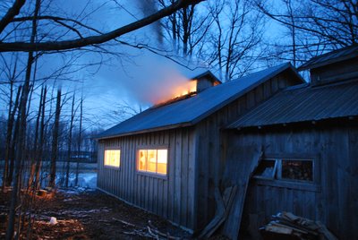 Illustrated is a traditional artisanal sugar shanty, its apparatus, and the complete maple sap-syrup evaporation process.