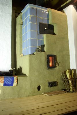 Contraflow stove with heated bench, faced in magnesite brick. Recycled hardware approximately 50 years old. Inlayed fragments of antique stove tiles.