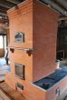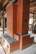 Contra-flow heater faced with clay brick and local slate. This heater has two extended manifolds which transmit the gases from the side channels to the the chimney, via the two slate topped benches.