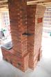 Un poêle de masse à contresens de 9 pieds de hauteur avec cuisinière. Le foyer et la cuisinière sont branchés sur le même conduit de cheminée. Les briques d'habillage locales fabriquées en 1900 et les tuiles peintes à la main en 1910 provenant de Catalogne, Espagne