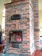 Poêle de masse à contre-sens de style Finlandais, avec four à cuire dans la chambre à combustion supérieure. Habillage en briques recyclées datant de 1910, décoré d`une bande de briques moulées antiques à relief entourant le foyer, datant de 1840