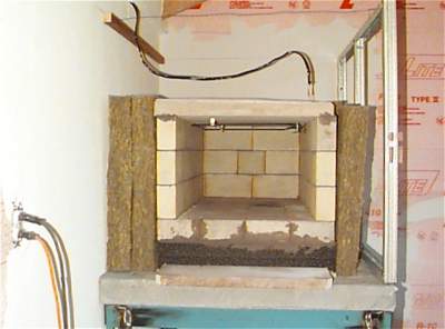 A hearth of 6" x 9" x 3" firebrick is set dry onto the foamed