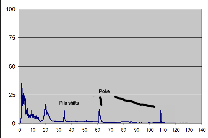 Very low CO. Lowest CO/CO2 ratio recorded to date, 0.0010, around 60 minutes.
