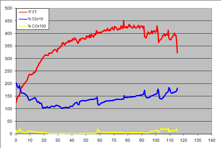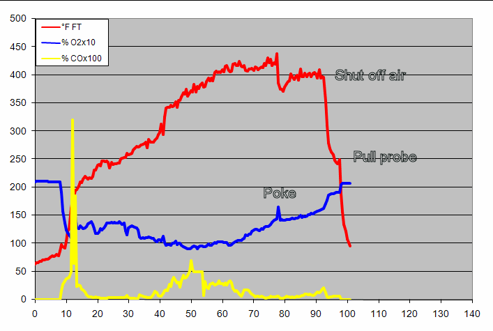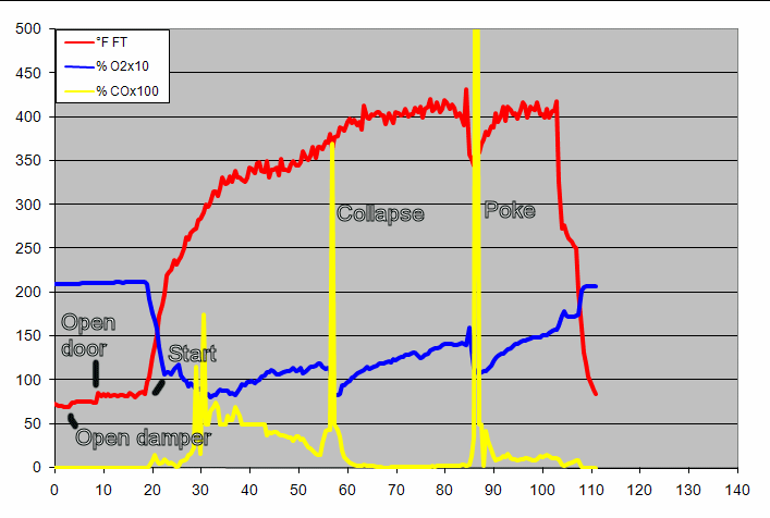 Good bright ignition. Huge CO spike at 14 minutes. Fire overamped (see animation). CO never really cleaned up