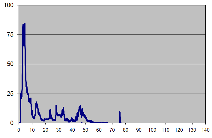 "Austrian style fuel". Very small pieces. 18 pieces. 3.9 lbs kindling. 60.4 lbs total. Pieces larger than yesterday: 3.2 lb vs. 2.1 lbs