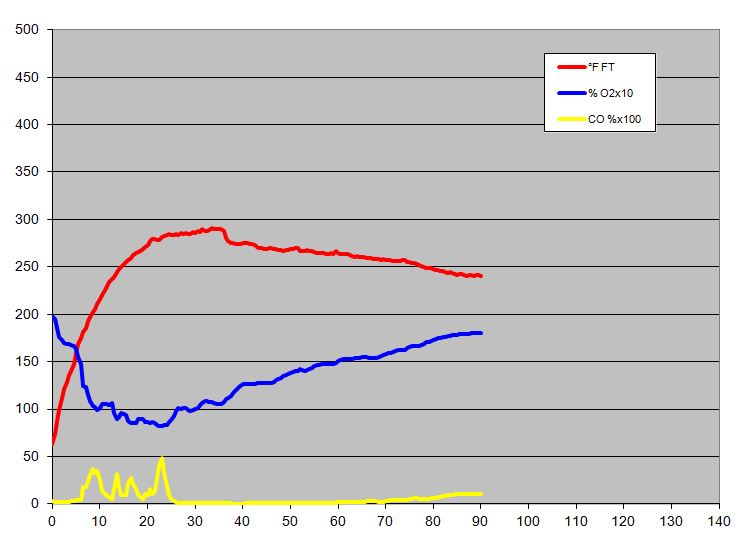 CO spike at the beginning, high PM from birch bark burning at around 10 minute mark.
